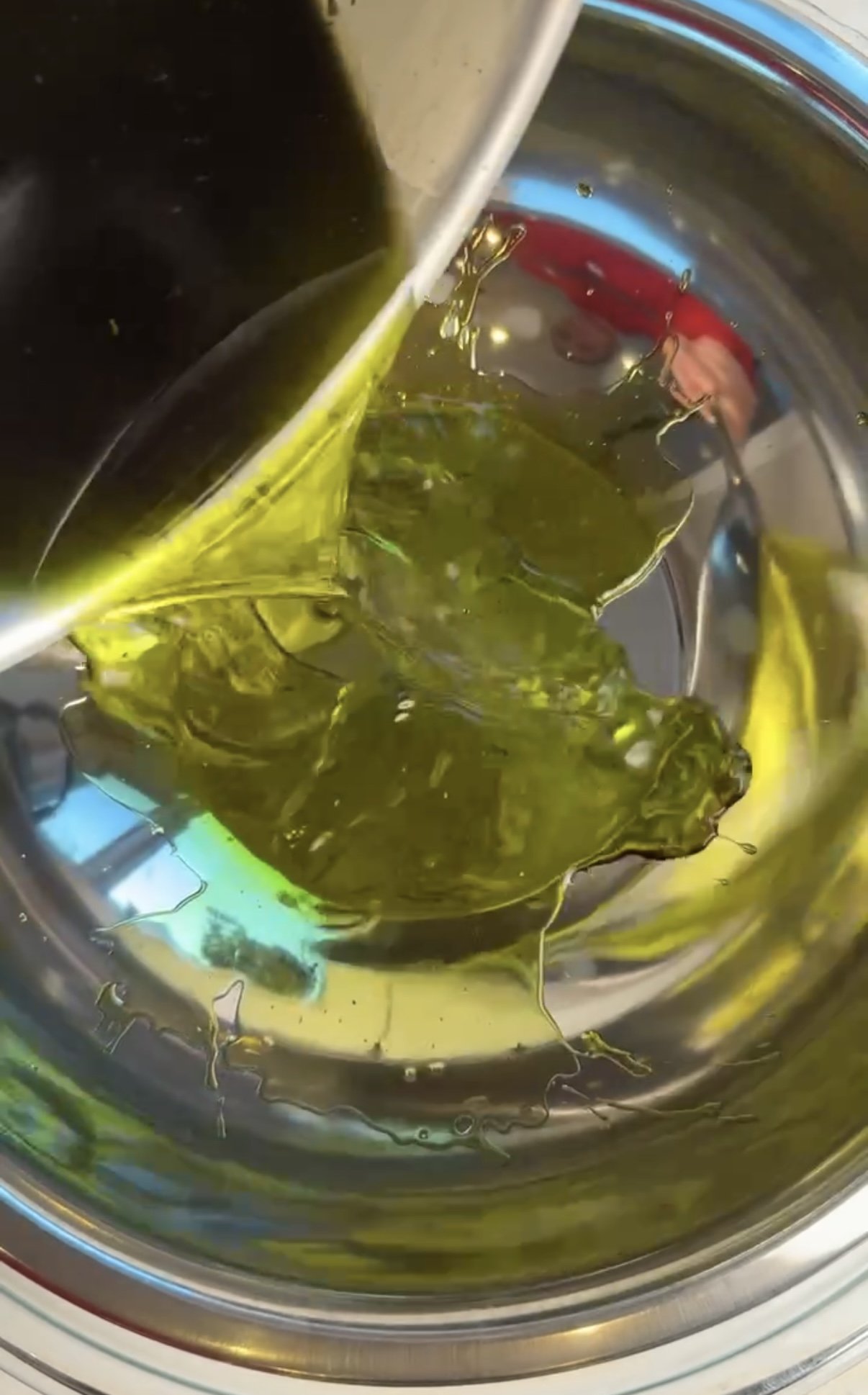 Once the basil oil has cooked, pour it into the fresh bowl, which is sitting on ice, and cool down the oil.