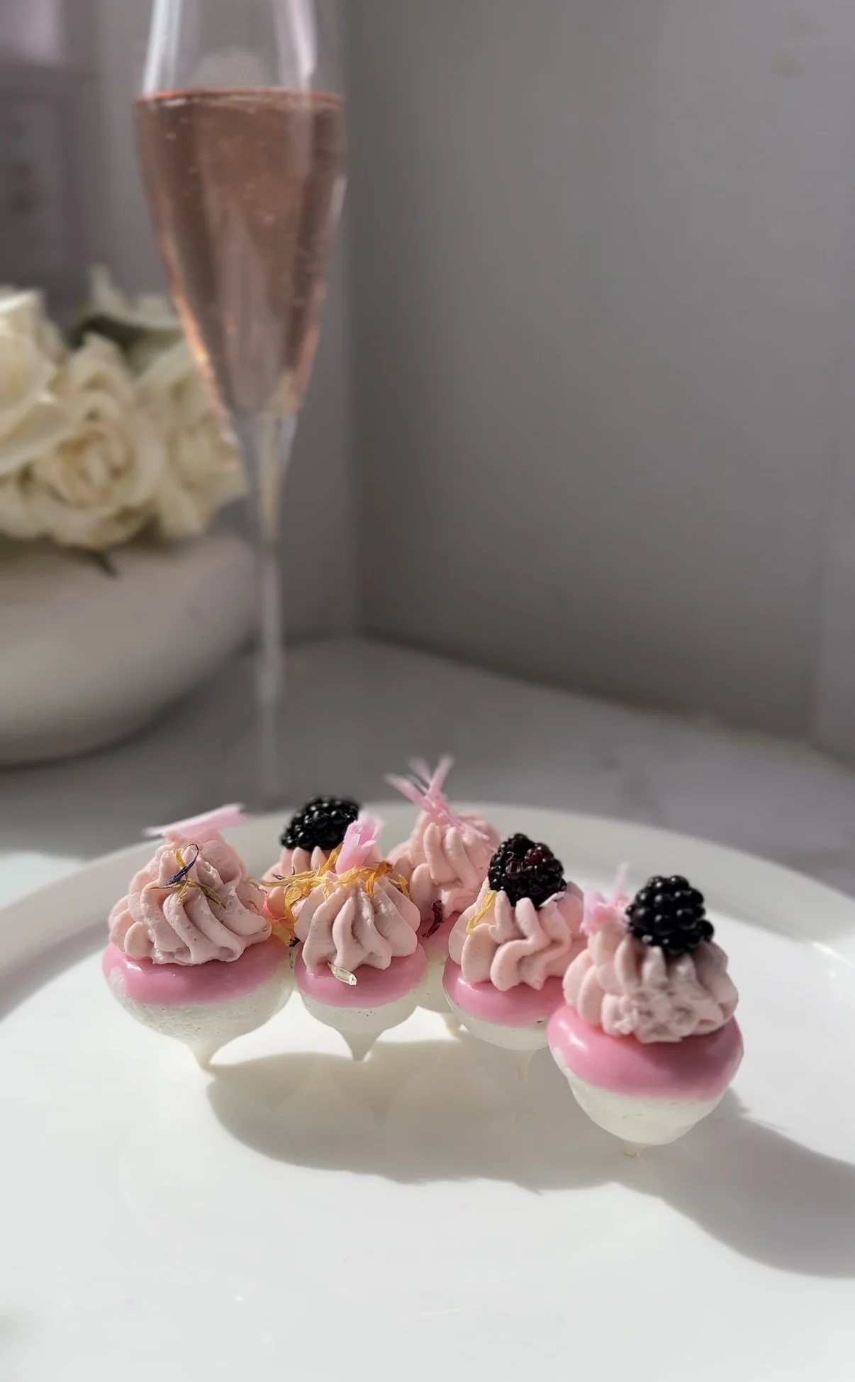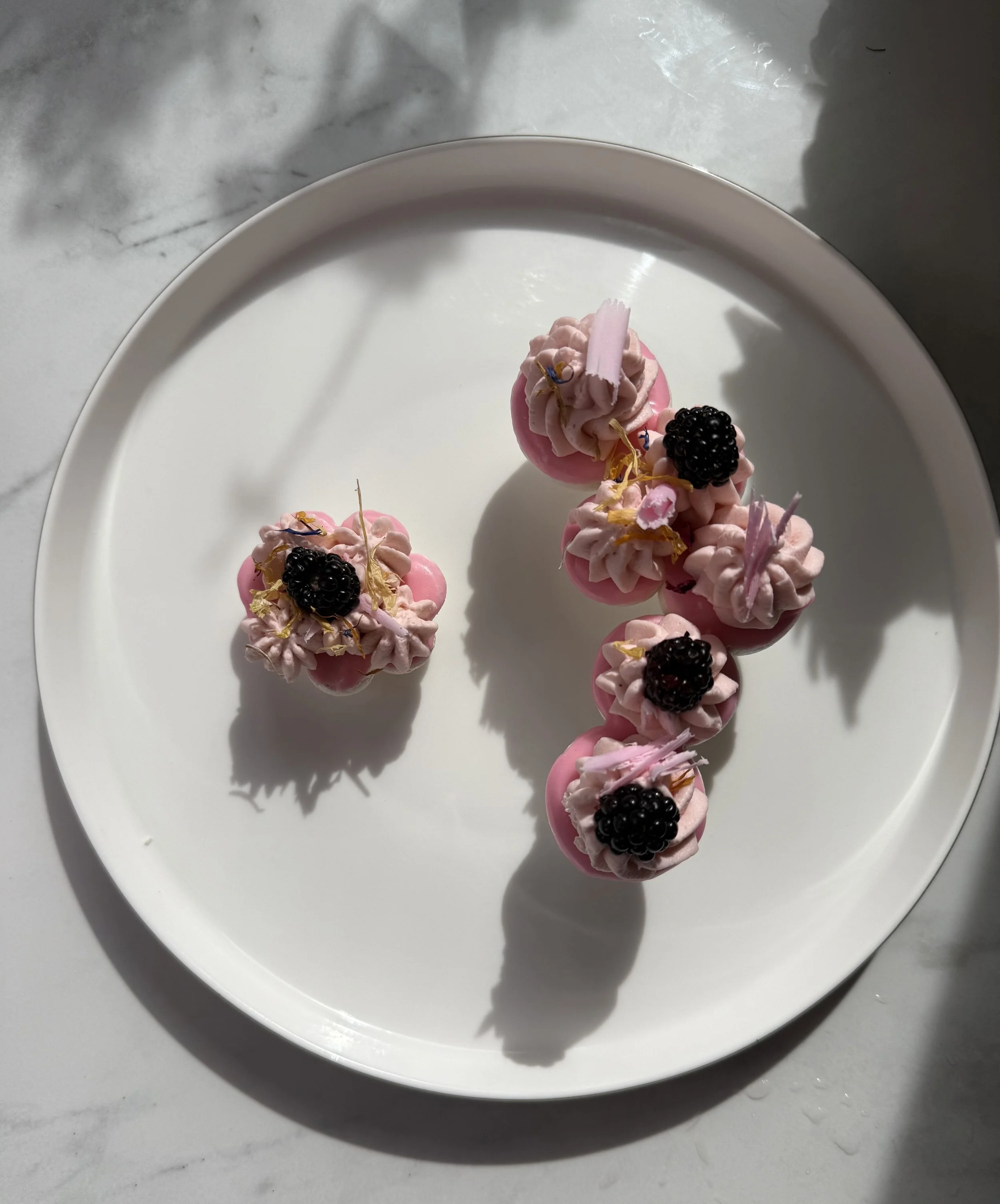 Pipe a dollop of whipped cream to match the size of each pavlova, starting at the center. Top with blackberry halves, raspberries, flower sprinkles, and/or chocolate curls.