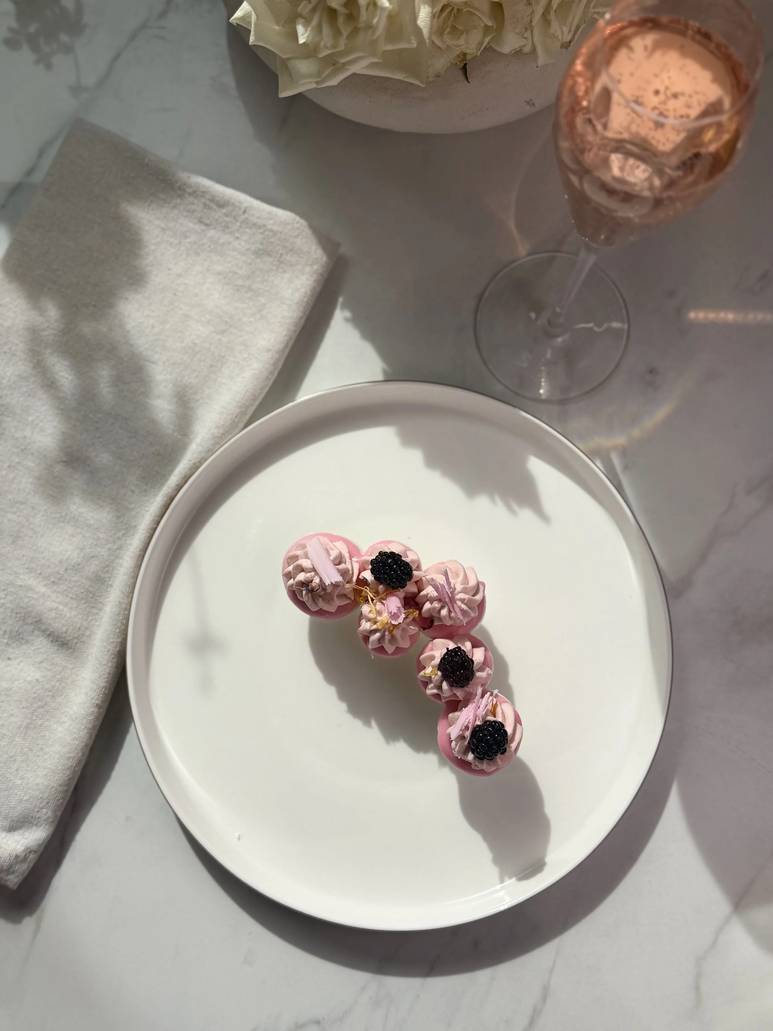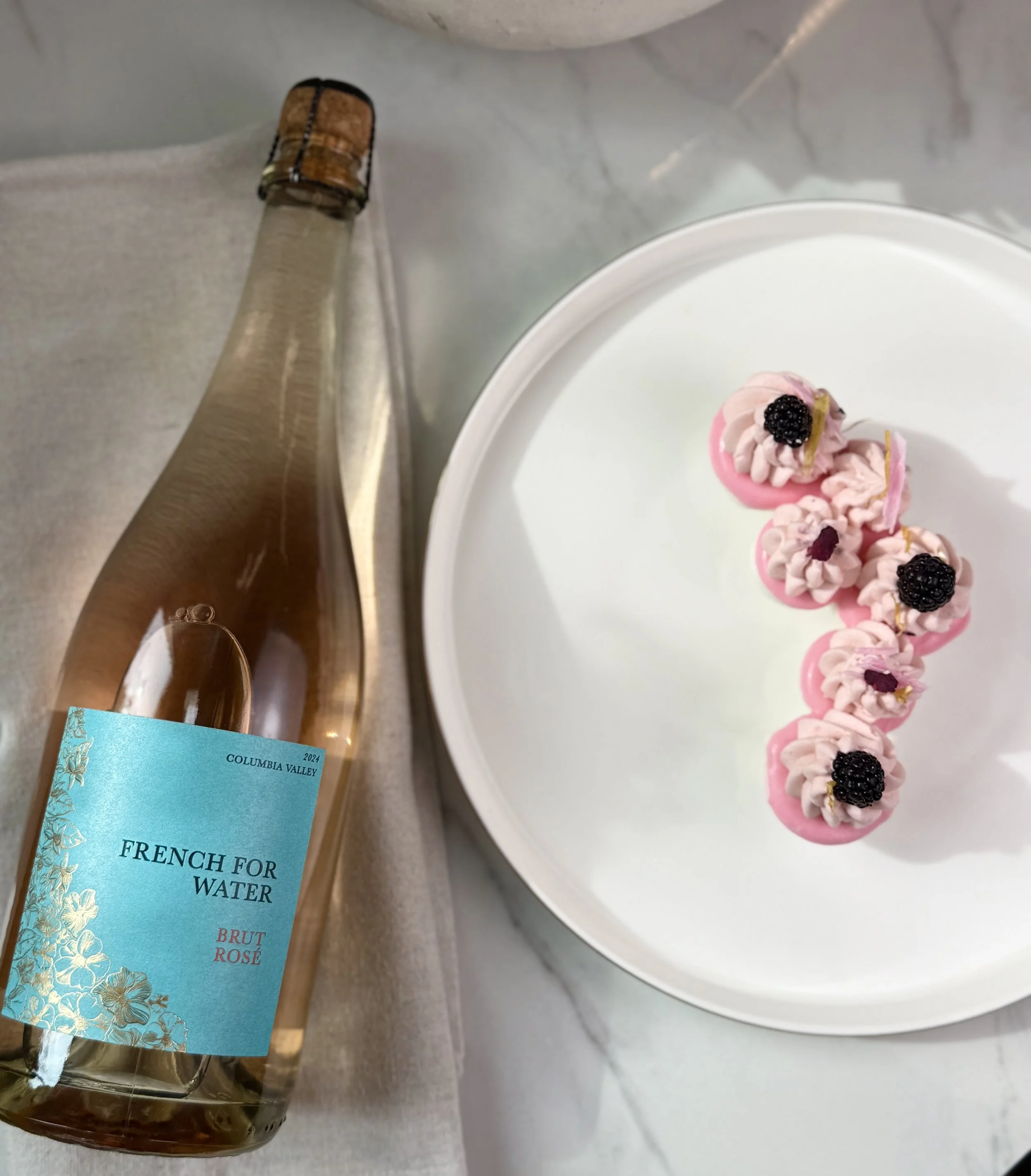 French for Water Brut Rose because the essence of the berry tea-infused whipped cream mirrors the berry notes you get with each sip of the rose. I think the crispness of the pavlova and the richness of the mascarpone cream play so beautifully with the dry, bubbly rose!